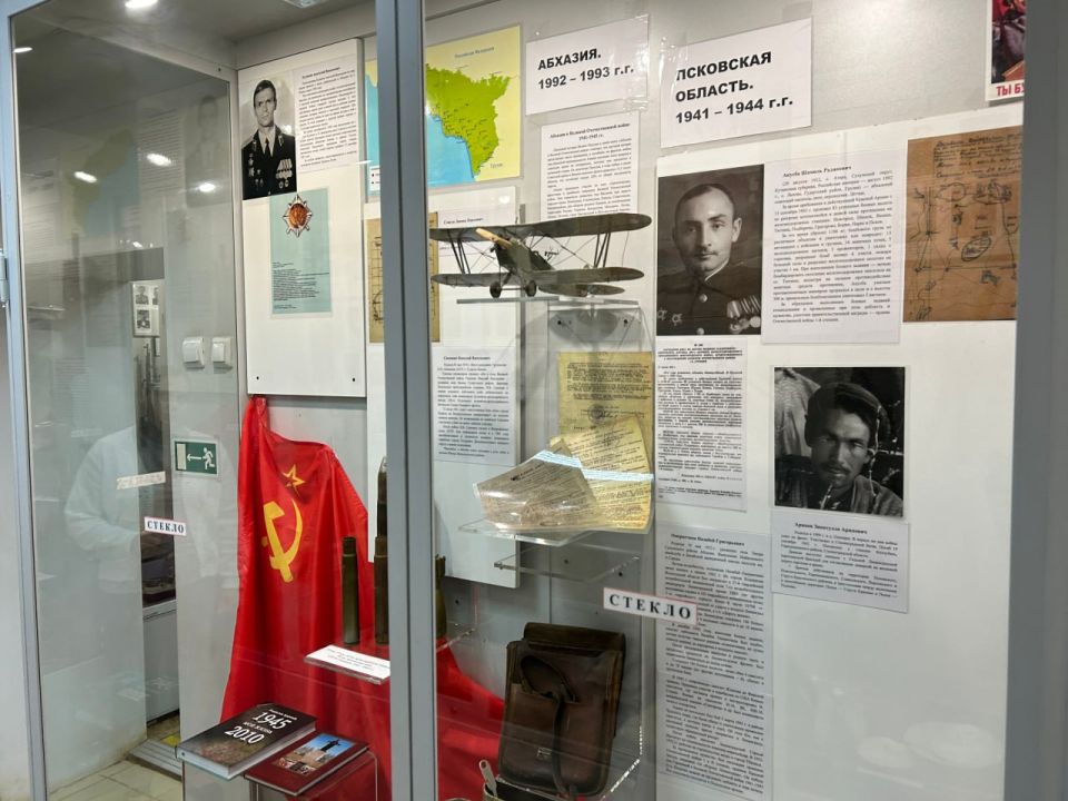 Посетители смогли ознакомиться с материалами о доблестных поступках добровольцев из Пскова, среди которых Анатолий Кудимов, участник грузино-абхазских событий.