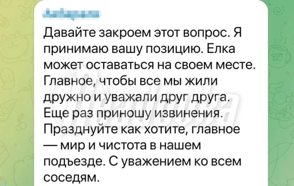 В итоге Абубакару пришлось отступить. Закончилась перепалка тем, что мужчина «разрешил» оставить елку, потому что главное — «мир и чистота в нашем подъезде».