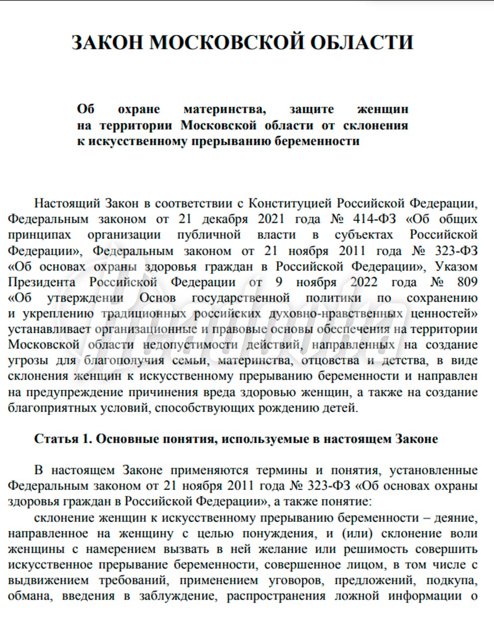 В Мособлдуму внесли законопроект, запрещающий склонение к абортам. В документе искусственное прерывание беременности хотят признать крайней мерой, которая должна применяться в случае отсутствия других методов влияния на женщину. Под склонением предлагается понимать «изменение воли женщины с намерением вызвать в ней желание сделать аборт» — от уговоров и подкупа до «отрицания ценности семьи, материнства и брака».