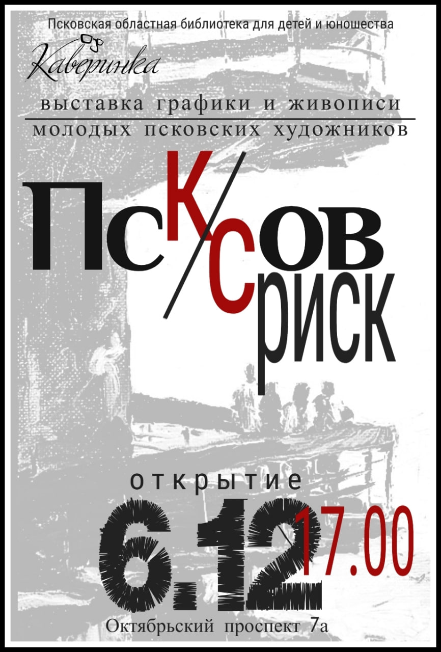 Псковская областная библиотека для детей и юношества "Каверинка" приглашает всех любителей искусства и жителей города на уникальное событие. 6 декабря в 17:00 в выставочном зале на веранде состоится торжественное открытие выставки "Псков: совриск".