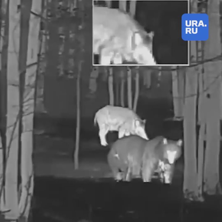Когда захотели поесть ночью, а у холодильника уже очередь. Два кабанчика и бурый медведь делили одну кормушку на троих в Нижегородской области. Необычную сцену сняли на тепловизор егеря, поделившись кадрами с URA.RU.