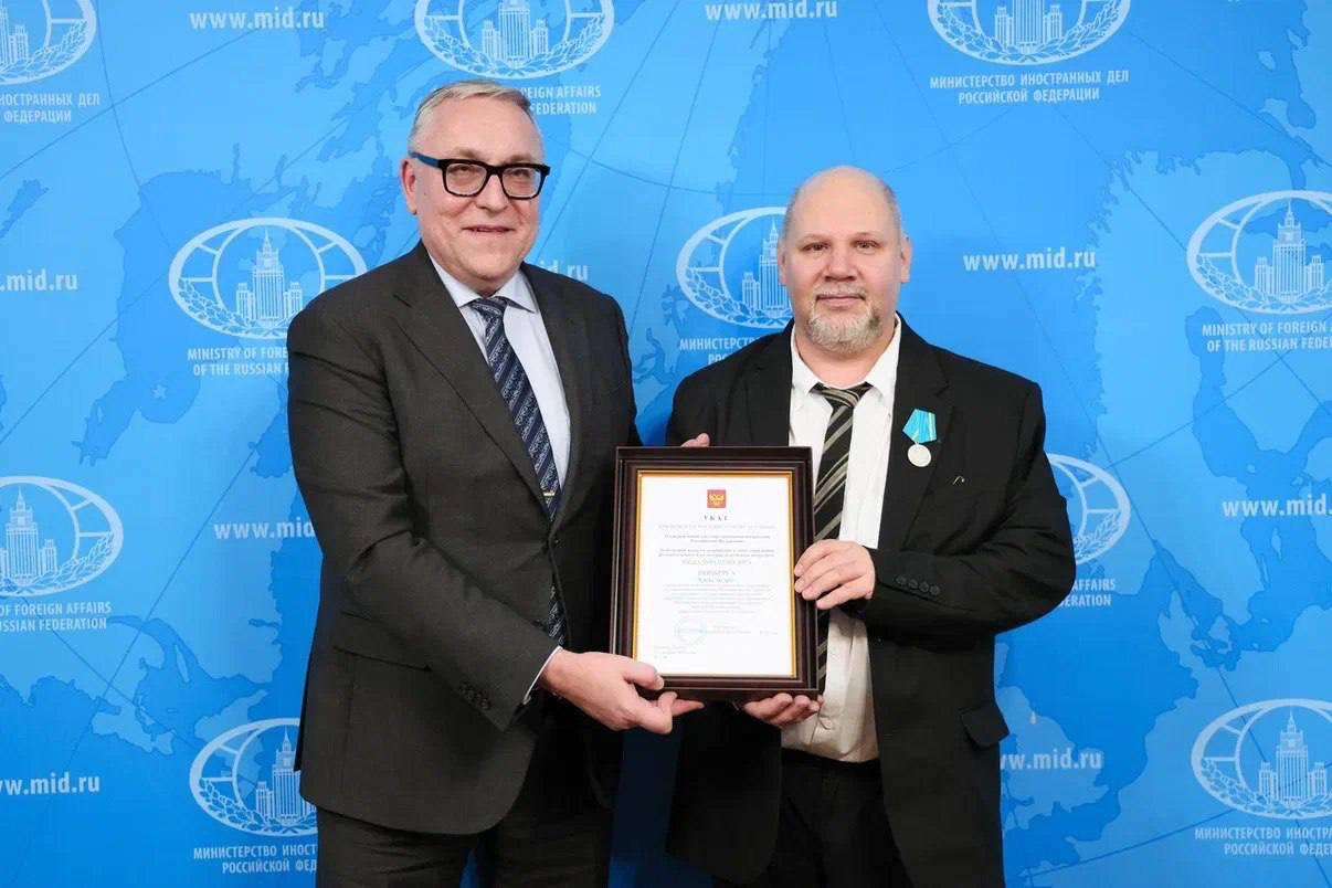 Д.Е.Любинский вручил А.Ницбергу российскую государственную награду – медаль Пушкина, которой он удостоен Указом Президента Российской Федерации за большой вклад в сохранение и популяризацию русского языка и культуры за рубежом.