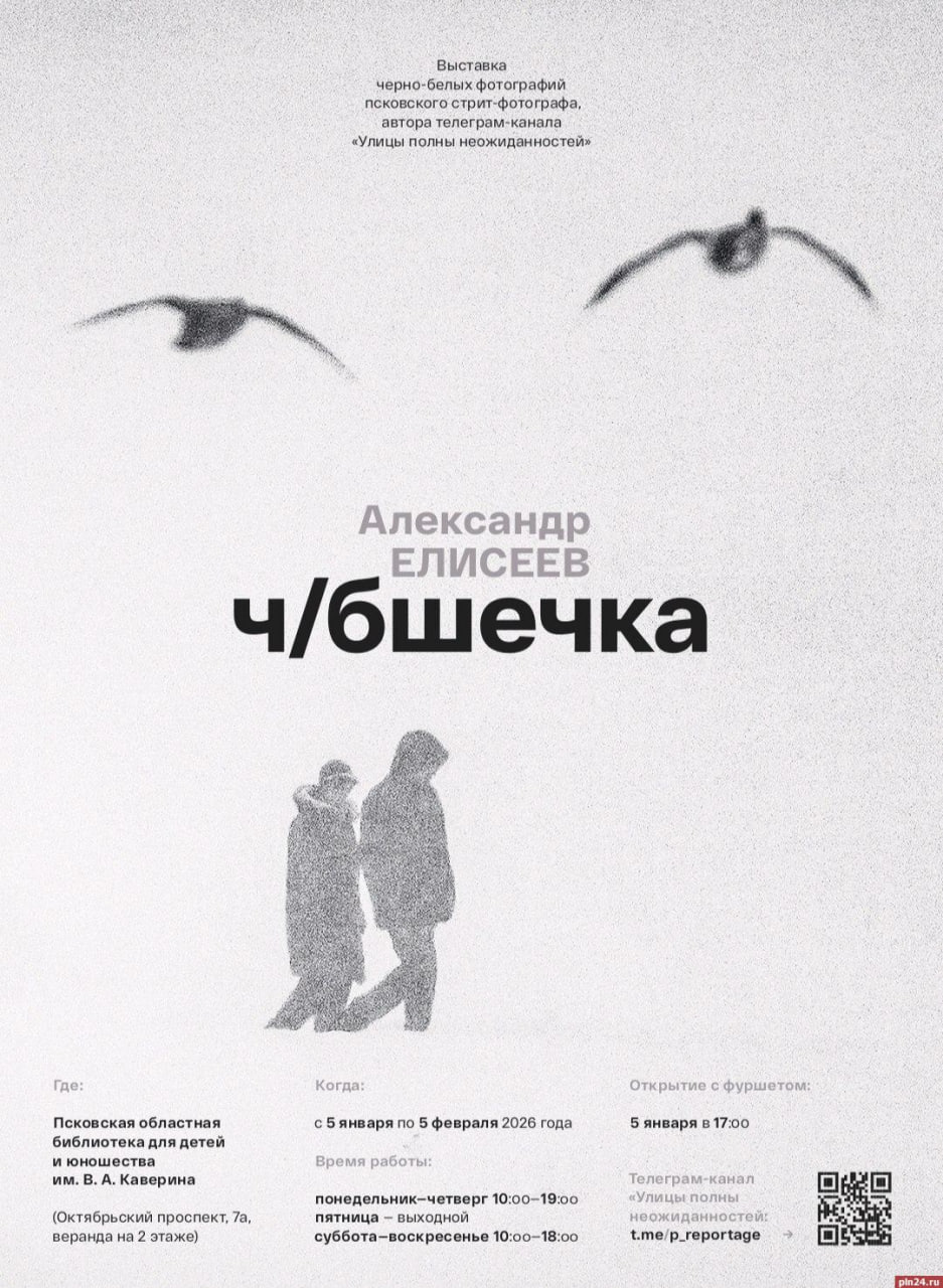 Открытие выставки «Ч/Бшечка» экс-фотокорреспондента Псковской Ленте Новостей Александра Елисеева состоится 5 января, в 17.00 в выставочном зале «Каверинки» на веранде.