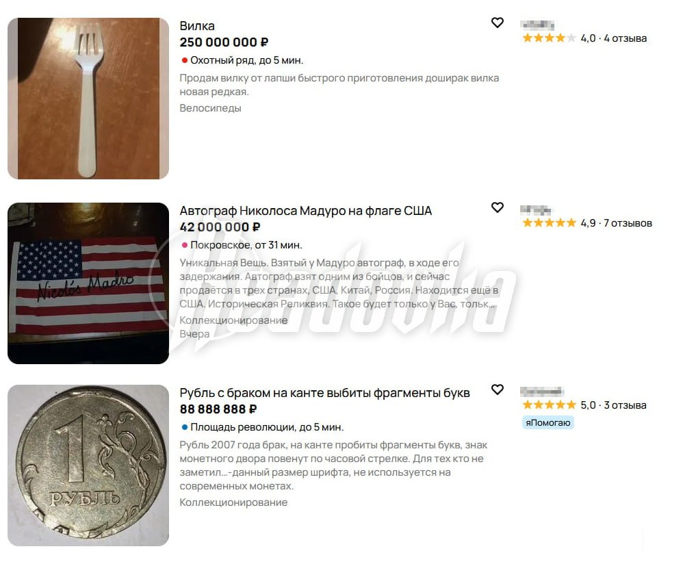 Если вы до сих пор не знаете, что подарить на Новый год или Рождество своим близким, то продавцы «Авито» готовы удивить вас своими необычными предложениями. Например, вы можете купить за 42 млн (или обменять на пять однушек в Москве) автограф Николаса Мадуро на флаге США. Владелец уверяет, что «историческая реликвия» подлинная и сейчас параллельно продается в Китае и Штатах. Если цена для вас не имеет никакого значения, то можно приобрести пластиковую вилку за 250 млн или коллекционный рубль почти за 89 млн.