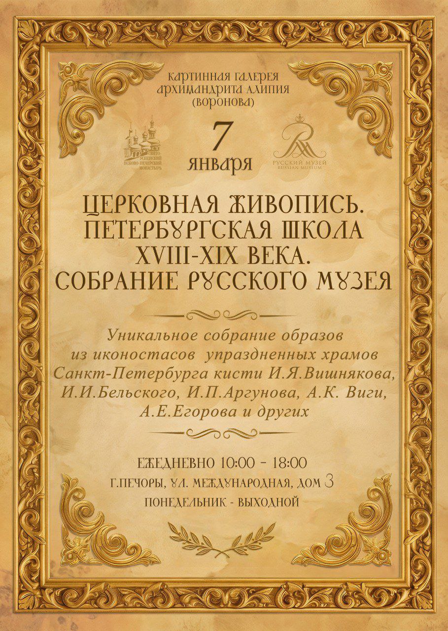 7 января 2026 года, в праздник Рождества Христова, в Картинной галерее архимандрита Алипия (Воронова) при Свято-Успенском Псково-Печерском монастыре состоится знаковое событие — открытие выставки "Церковная живопись. Петербургская школа середины XVIII – первой четверти XIX века". Экспозиция полностью сформирована из фондов Государственного Русского музея. Об этом сообщили в телеграм-канале Псковской епархии.