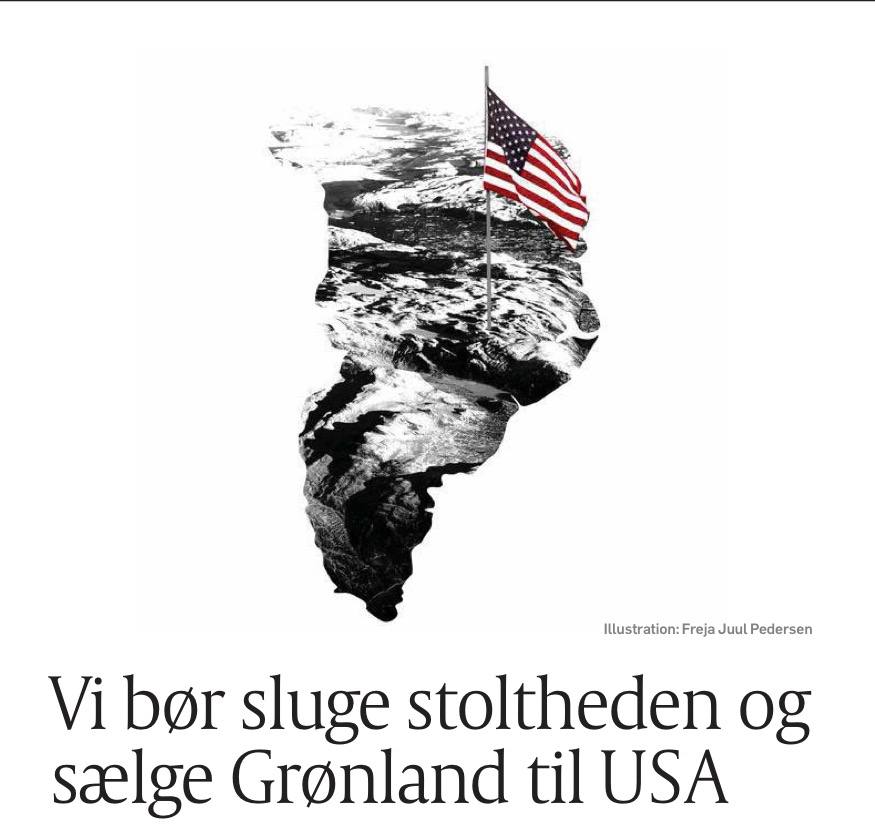 Только я написал о том, что Дания перешла к стадии торга по поводу Гренландии и уже осторожно начали интересоваться ценой, которую США готовы заплатить за островок - и вот на страницах Politiken публикуется следующее письмо: «Нам следует проглотить свою гордость и продать Гренландию США».