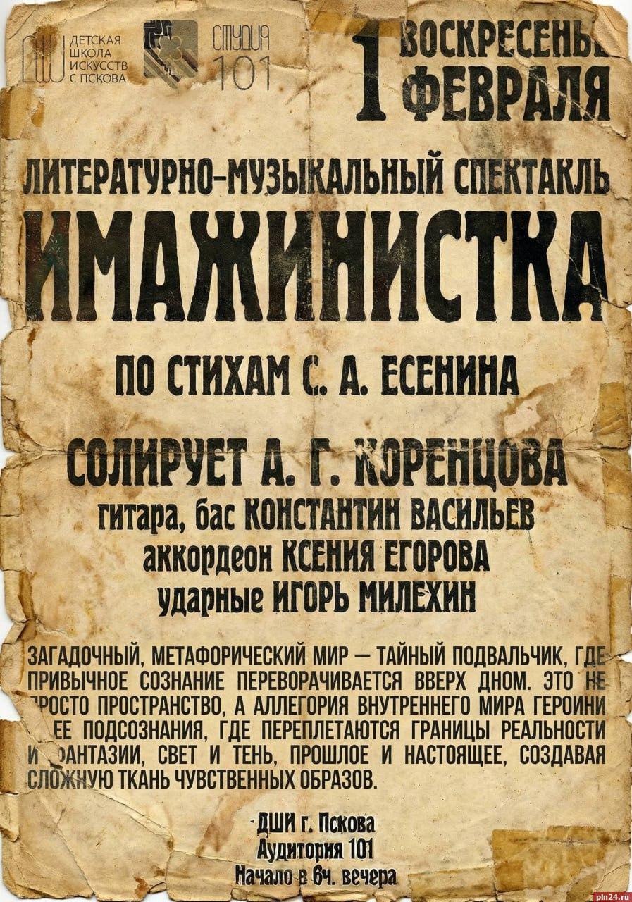1 февраля в 18:00 в Детской школе искусств (ул. Олега Кошевого, 8, ауд. 101) состоится премьера необычного спектакля «Имажинистка», созданного по стихам Сергея Есенина.