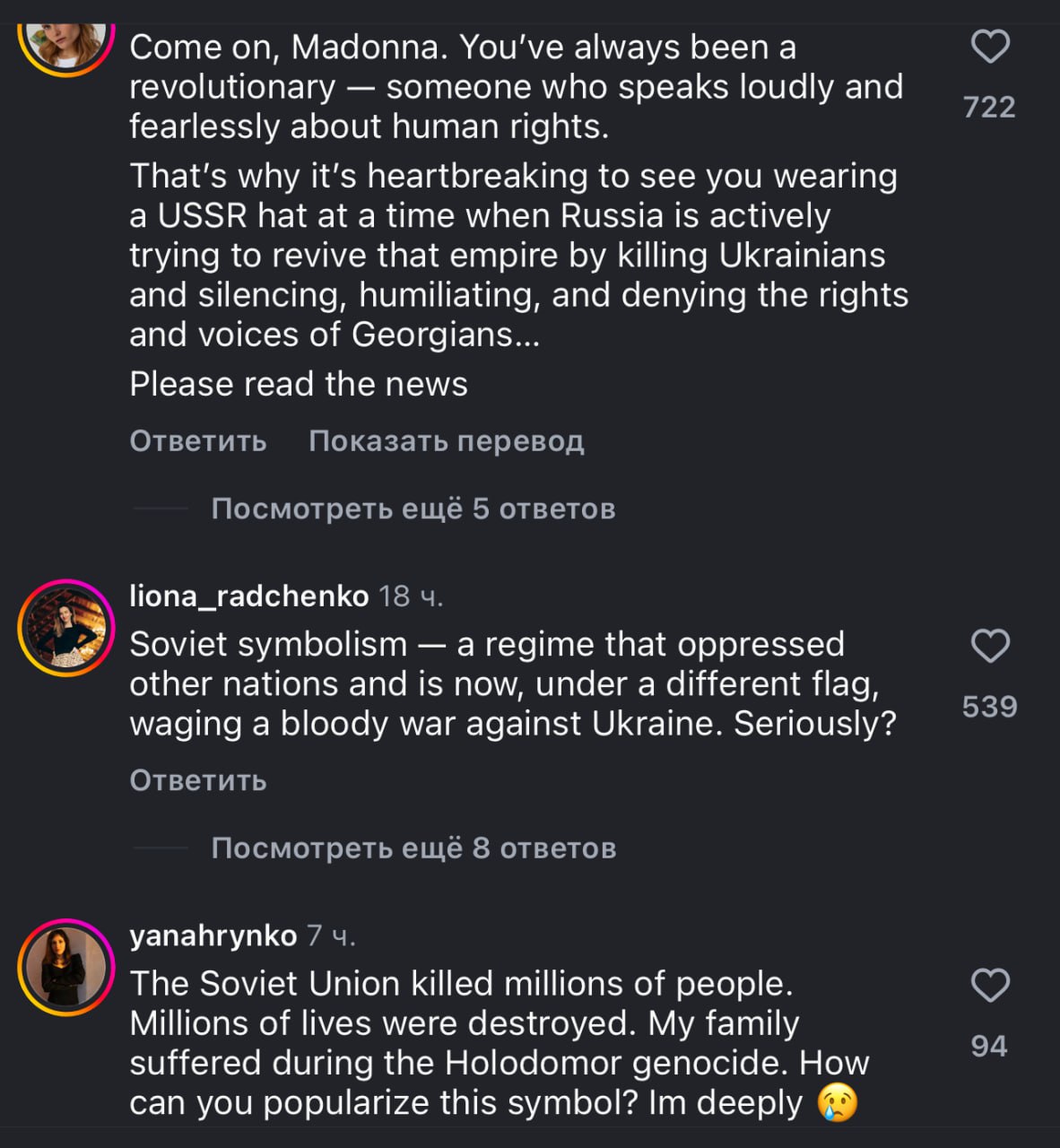 В комментариях ожидаемо началась вакханалия с участием обиженных и оскорбленных украинцев, противников и сторонников СССР, поклонников певицы и тех, кто уже готов ее отменить. Настрочили уже почти три тысячи комментов.