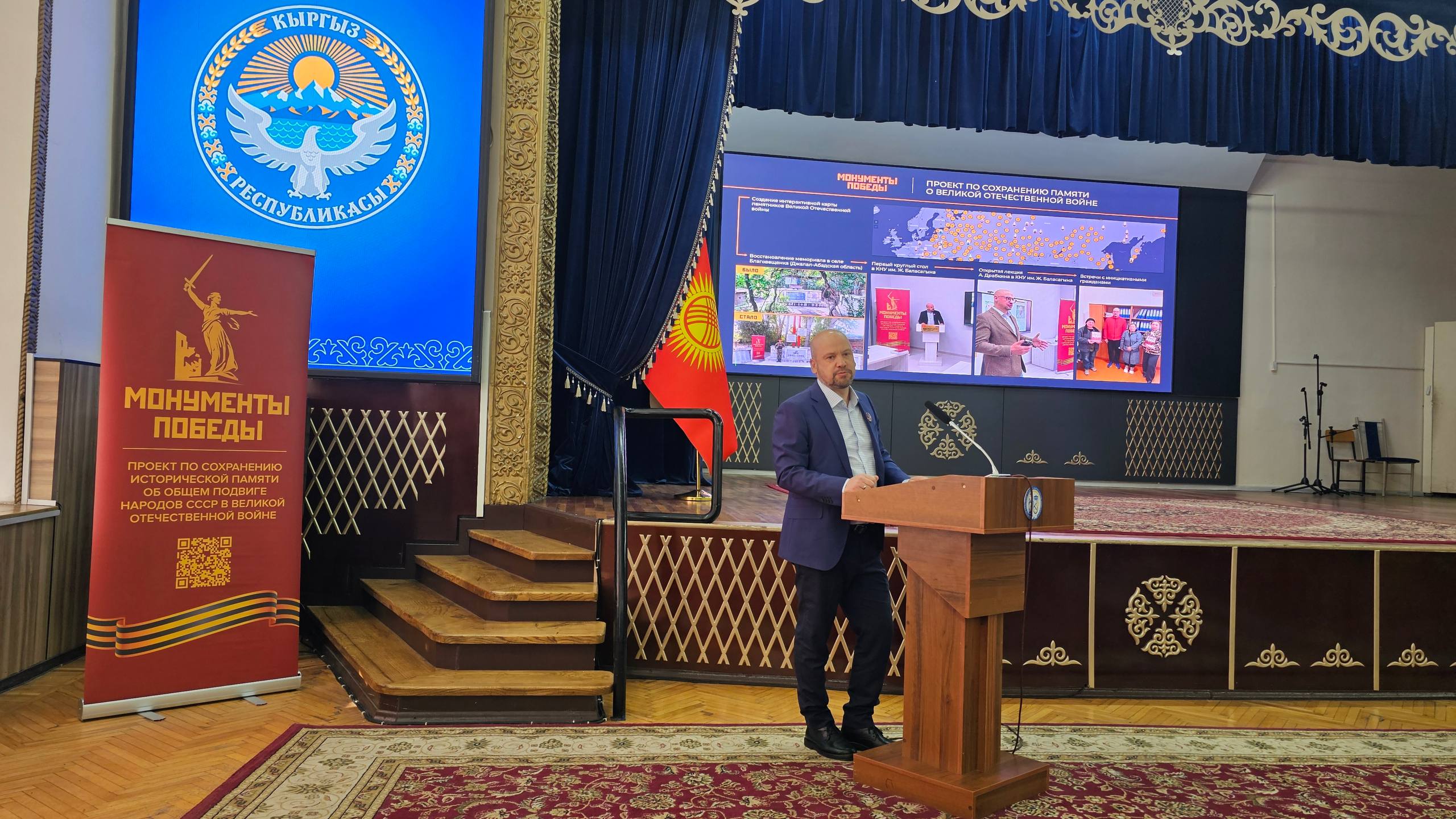 С приветственными словами к собравшимся обратились советник Посольства России в КР Сергей Храмов, руководитель Русского дома в Бишкеке Альберт Зульхарнеев, представитель российского проекта Монументы Победы Илья Левитан, ректор КНУ Догдурбек Чонтоев, депутат Жогорку Кенеша КР Гуля Кожокулова, советник Посольства Белоруссии в КР Виталий Семашко.