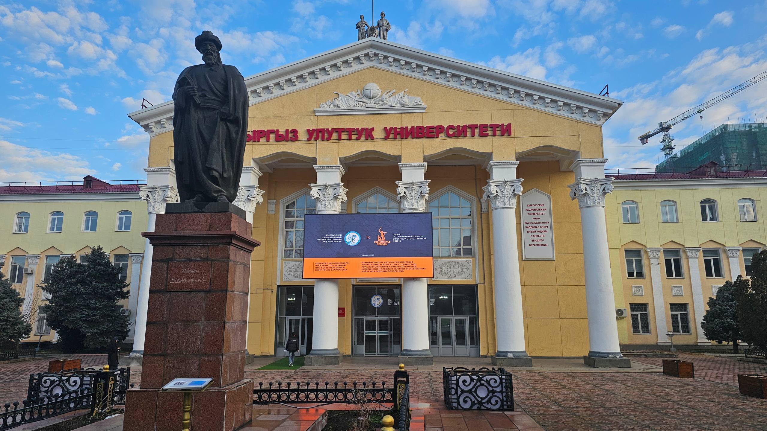 В фойе главного корпуса КНУ состоялась презентация фотовыставки Историческая память о Великой Отечественной войне. В большом актовом зале университета прошла церемония открытия международной научно-практической конференции Кыргызстан и Сталинград: роль журналистики и кино в сохранении исторической памяти о Великой Отечественной войне для будущих поколений.