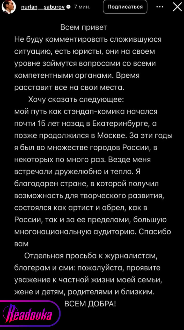 Комик Нурлан Сабуров, которому запретили въезд в Россию на ближайшие 50 лет, впервые высказался о ситуации с его выдворением. Он удалил все фото со своей страницы и написал, что юристы занимаются вопросами со всеми компетентными органами, но какими именно вопросами — не уточнил. Возможно, так он намекнул на свое решение оспорить запрет на въезд. Кроме того, комик, который ранее позволял себе антироссийские высказывания, оскорблял зрителей и критиковал СВО, поблагодарил нашу страну: