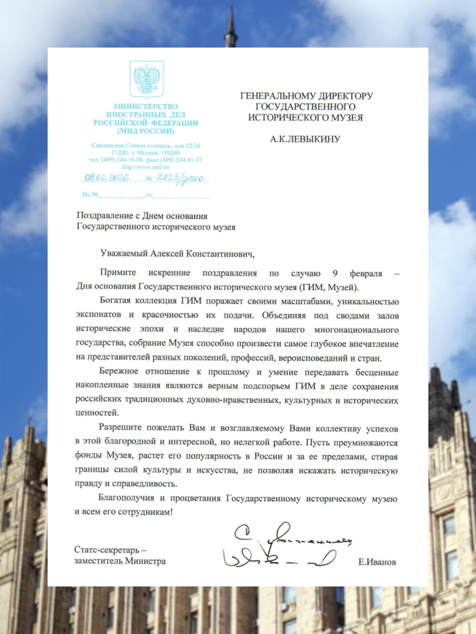 Поздравление Статс-секретаря – заместителя Министра иностранных Дел Российской Федерации Е.С.Иванова генеральному директору Государственного исторического музея (#ГИМ) А.К.Левыкину с Днём основания ГИМ: