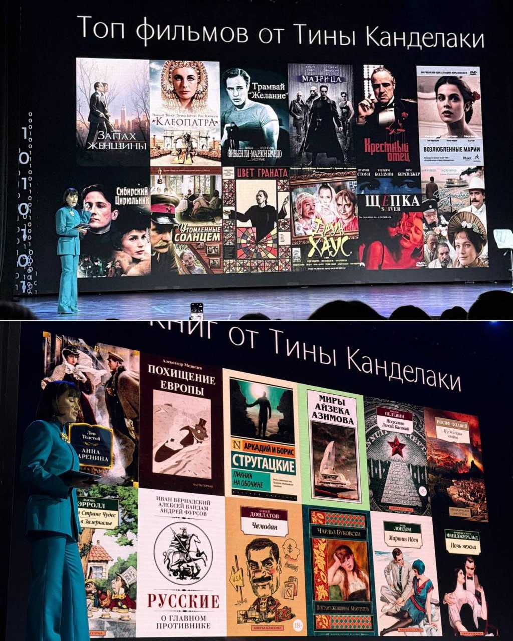 Тинатин Гивиевна на своей лекции поделилась с залом личным списком книг и фильмов. Перечень разношерстный, но многое здесь оказалось пророческим: Матрица, Щепка, и куда же без Пелевина, Стругацких, Азимова и Кэролла. Вечная классика, опередившая время.