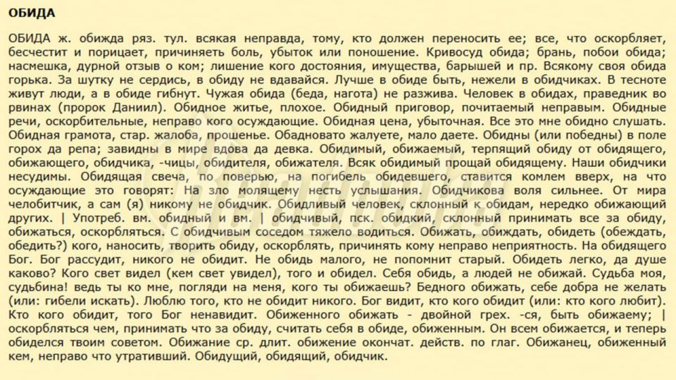«Что такое слово "обиженка"? Вот Даля словарь открываем — это человек, который постоянно жалуется. Там есть такое слово, это не оскорбительное, это в словаре Даля», — заявила Readovka депутат. Однако мы проверили — такой формы там нет.