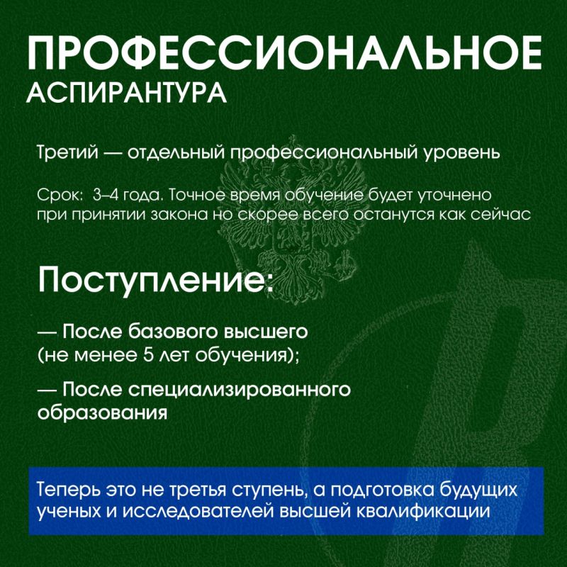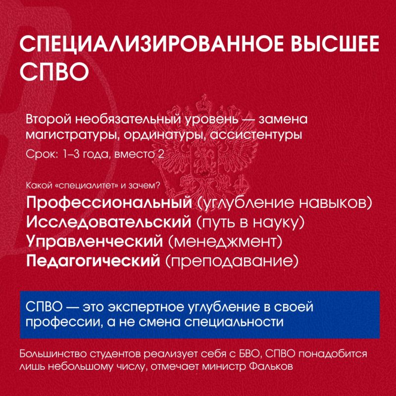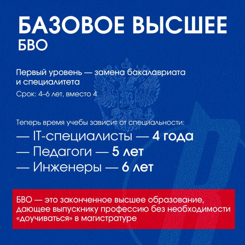Реформа предполагает три уровня образования: базовое высшее (БВО), специализированное (СПВО) и профессиональное — аспирантуру. Новый формат базового высшего образования ближе к советскому специалитету: он объединяет теорию и практику, дает углубленные знания по одной профессии и позволяет выпускать готовых специалистов.