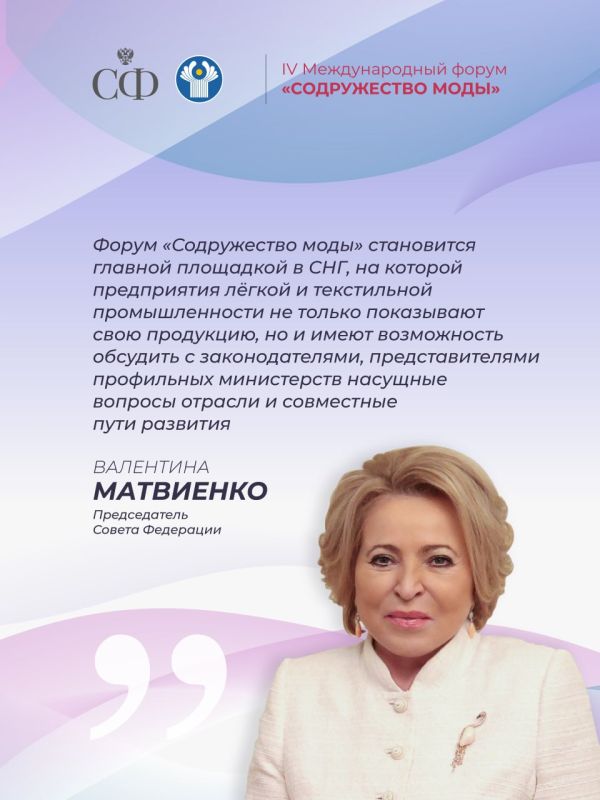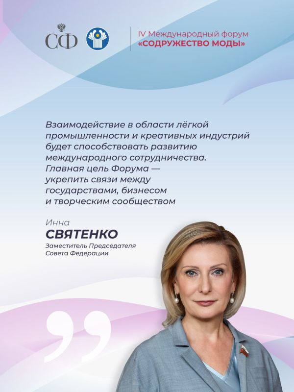 Председатель Совета Федерации Валентина Матвиенко и сенаторы Российской Федерации примут участие в его работе. Форум объединяет производителей лёгкой промышленности и представителей креативных индустрий из более чем 30 стран.