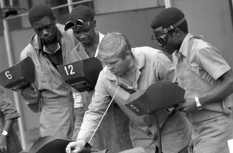 2. Советский преподаватель Игорь Фокин проводит урок-практикум по сварке металла в Индустриальном педагогическом техникуме имени Хо Ши Мина, Народная Республика Ангола, 1 марта 1983 г.