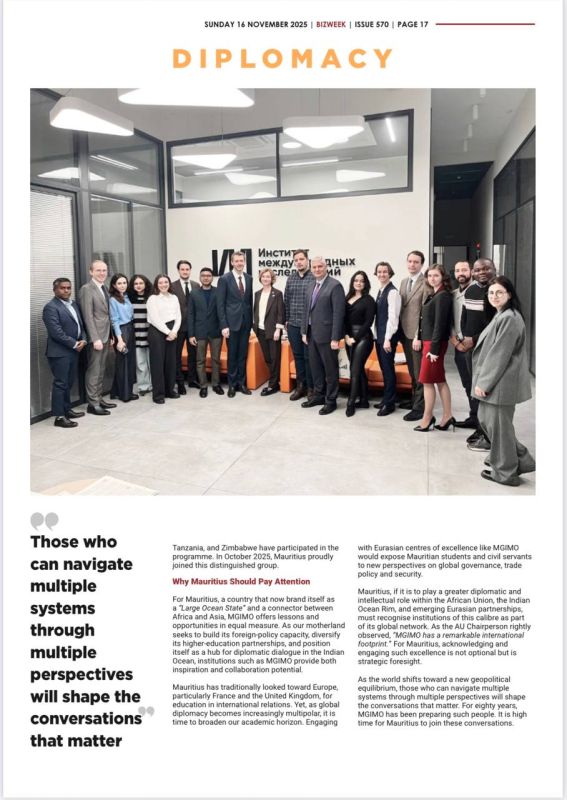 Статья в маврикийской прессе «МГИМО: университет, где дипломатия встречается с миром» (Bizweek, 16 ноября 2025 г.)