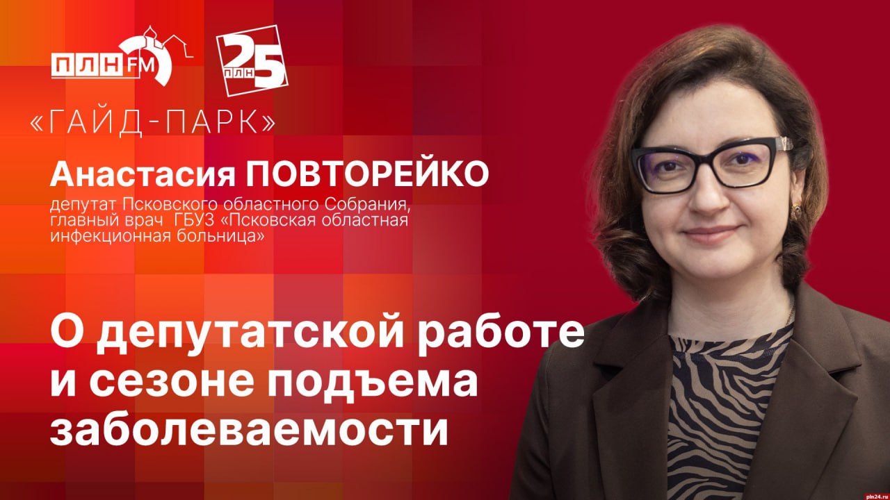 Слушайте в прямом эфире радио «ПЛН FM» (102.6 FM) новый выпуск программы «Гайд-парк». Гость студии - депутат Псковского областного Собрания, главный врач Псковской областной инфекционной больницы, главный внештатный пульмонолог нашего региона. Анастасия Повторейко. Ведущий Артем Татаренко обсудит с ней широкий круг вопросов, связанных с депутатской и профессиональной деятельностью — от формирования бюджета Псковской области на 2026 год и плановый период до сезонного подъема заболеваемости.