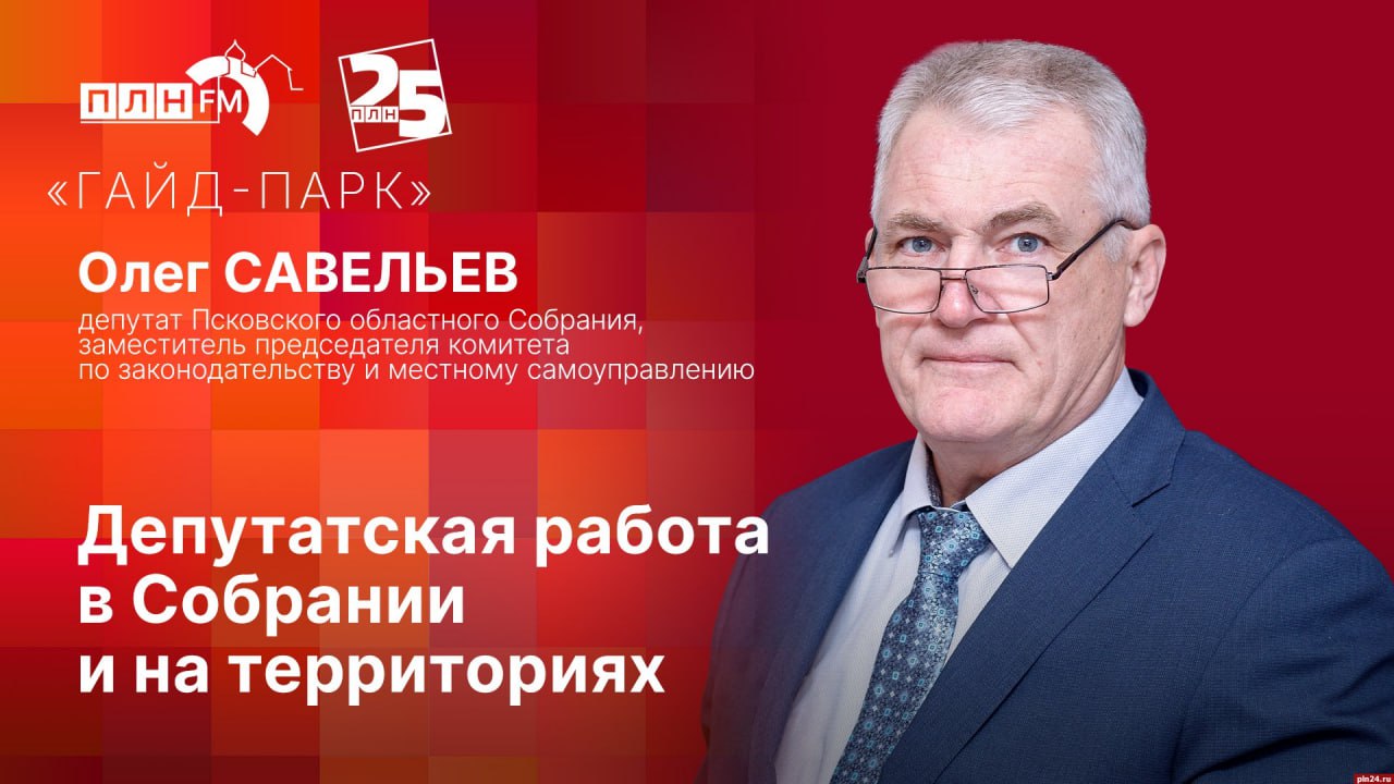 Слушайте в эфире «ПЛН FM» (102.6 FM) новый выпуск программы «Гайд-парк». Гость студии - депутат Псковского областного Собрания, заместитель председателя комитета по законодательству и местному самоуправлению Олег Савельев. Ведущая Любовь Кузнецова обсудит с ним широкий круг вопросов, связанных с его депутатской деятельностью.