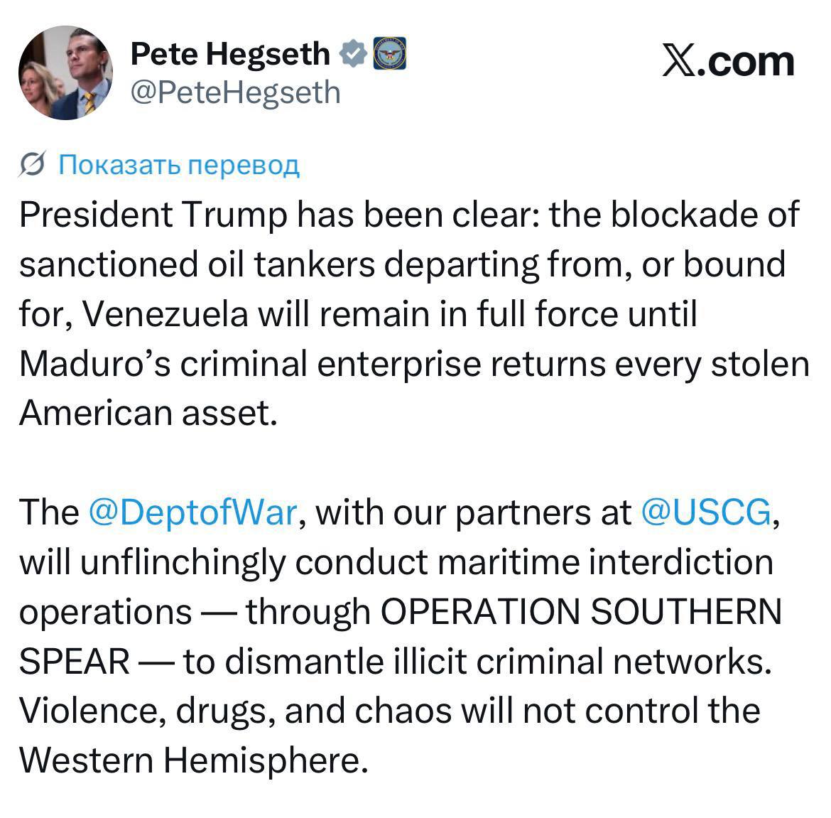 Министерство войны совместно с нашими партнёрами из Береговой охраны не дрогнув будет проводить морские операции по перехвату — в рамках операции «Южное Копье» — для демонтажа незаконных преступных сетей. Насилие, наркотики и хаос не будут контролировать Западное полушарие», - написал он.