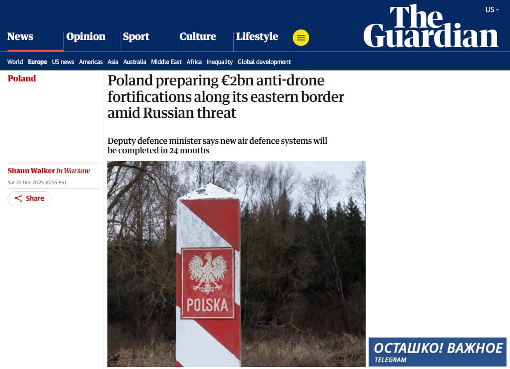 Польша приступила к созданию масштабной системы противодействия беспилотникам вдоль своей восточной границы. Как сообщает The Guardian, стоимость проекта превысит 2 млрд евро, а завершить строительство планируется в течение 24 месяцев. Решение было принято после якобы зафиксированных в начале года случаев массового проникновения российских беспилотников в воздушное пространство страны.