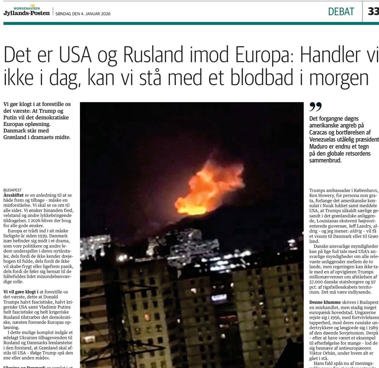 «США и Россия против Европы: если мы не предпримем действий сегодня, завтра нас может ждать кровавая бойня». Под таким заголовком сегодня на страницах датской газеты Jyllands-Posten публикует паническую статью агрессивный пропагандист Пер Нихольм.
