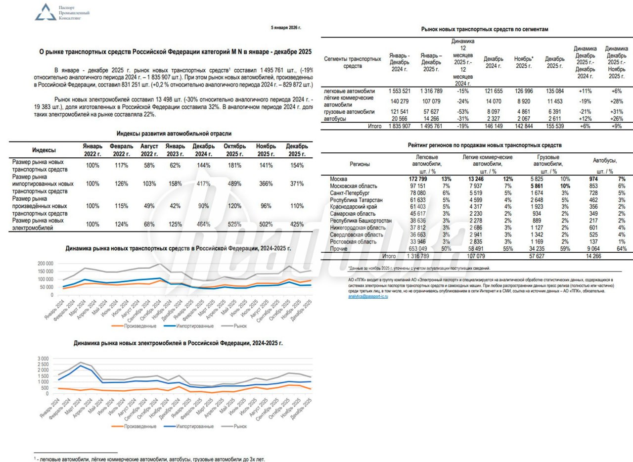 Кроме того, доля российской техники по итогам 2025 выросла на 11% по сравнению с предыдущим годом. Сегмент электромобилей также не остался в стороне и потерял 30% продаж на российском рынке. Больше всего машин по итогам прошедшего года купили в Москве и Московской области.