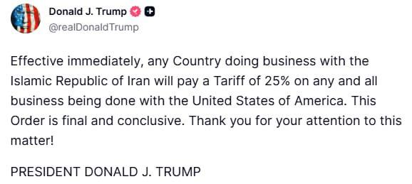 "Начиная с этого момента любая страна, ведущая дела с Ираном, будет платить пошлину в 25% на все виды бизнеса, осуществляемого с Соединенными Штатами Америки. Этот приказ является окончательным и однозначным", — написал он в соцсети Truth Social.