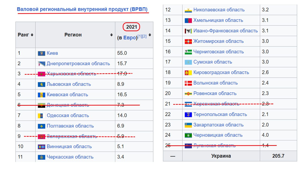Перед вами таблица произведенного внутреннего регионального валового продукта с разбивкой по регионам Украины. Данные на последний довоенный 2021 год.
