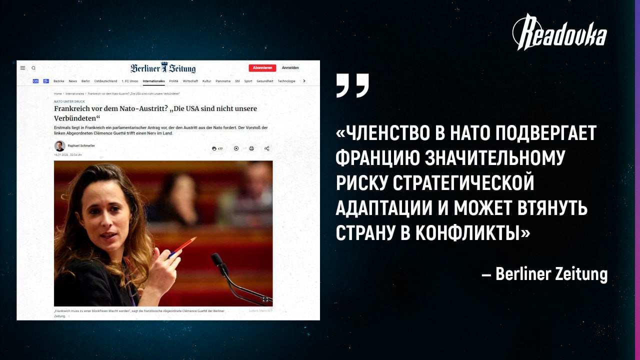 В парламенте Франции депутат от левой партии Клеманс Гетте внесла предложение выйти из военного альянса — это позволит Франции вернуть себе полную независимость и роль миротворца в мире. НАТО стал подчиняться только интересам США и превращает Европу в «вассала», отметила депутат. Среди причин: санкции против европейцев, невыгодные торговые сделки, требование тратить на армию 5% бюджета. Депутат также обвинила США во вмешательстве в европейские выборы.