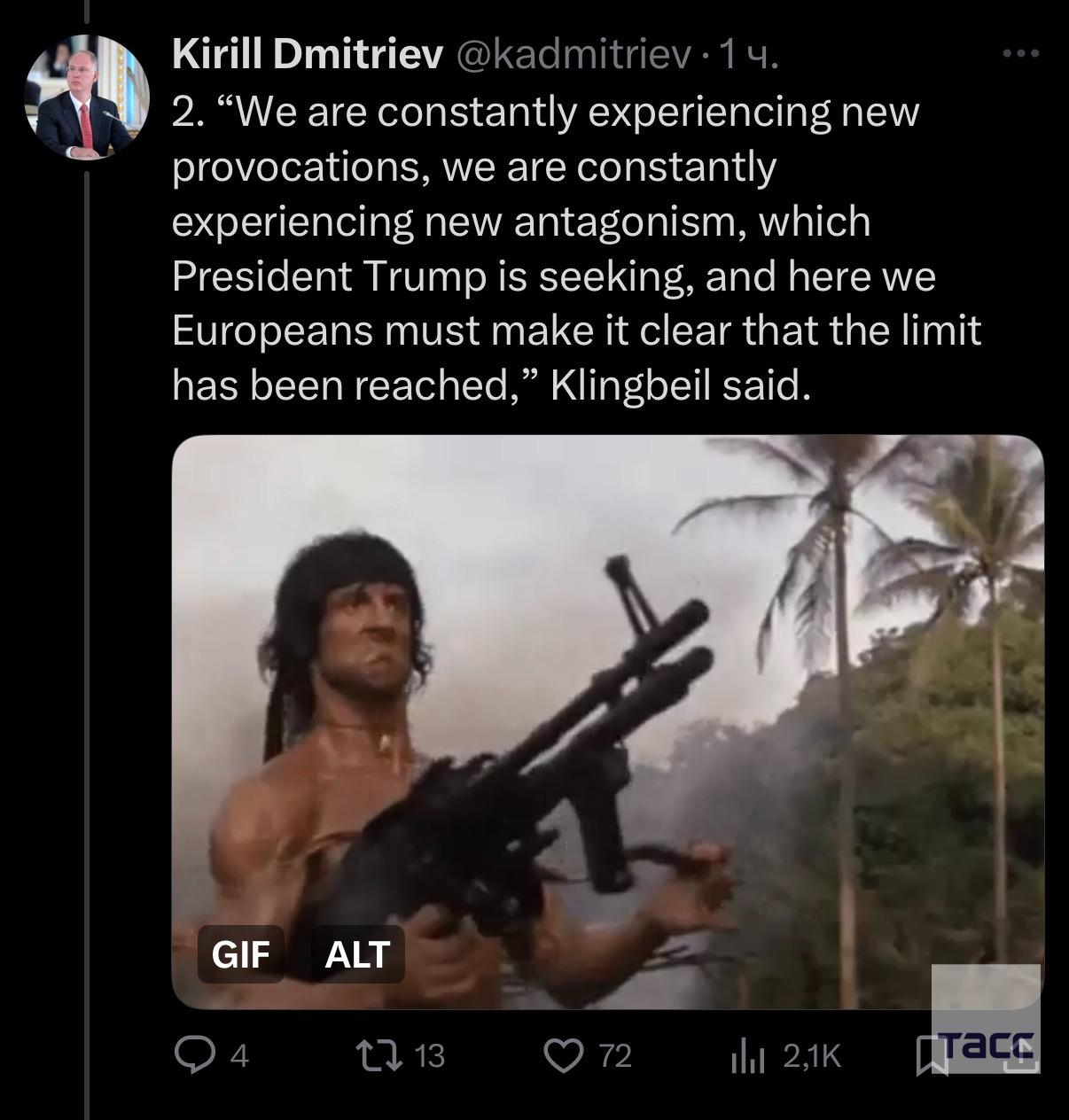 "Даже министр финансов Германии Клингбайль полностью перевоплотился в Рэмбо", — заявил Дмитриев после слов главы Минфина ФРГ о Гренландии.