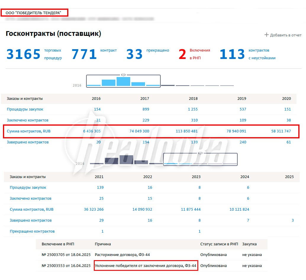 Но к 2025 году магия окончательно развеялась, и ФАС внесла «Победителя» в реестр недобросовестных поставщиков за систематическое уклонение от обязательств. Так что весь 2026 год компания с громким именем проведет без доступа к новым закупкам и бюджетным средствам — бизнесмены получили двухлетний запрет на участие в торгах.