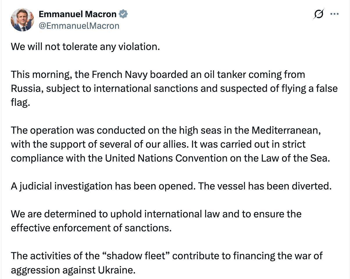 Макрон объявил о том, что французские военные «при поддержке некоторых союзников» захватили в Средиземном море нефтяной танкер, который следовал из России, «субъекта международных санкций». Значит, пора захватывать французские торговые суда.