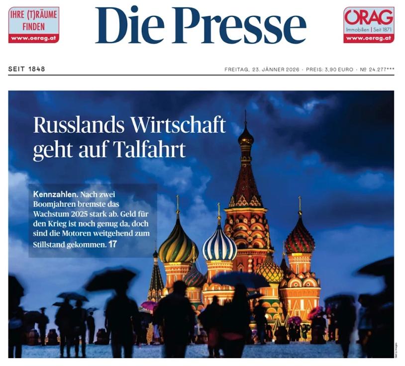Удивительные люди в Европе! Столько событий там происходит сейчас, а посмотрите на сегодняшнюю первую полосу австрийской газеты Die Presse: «Российская экономика в упадке». То есть главная новость дня для Европы и самой Австрии!