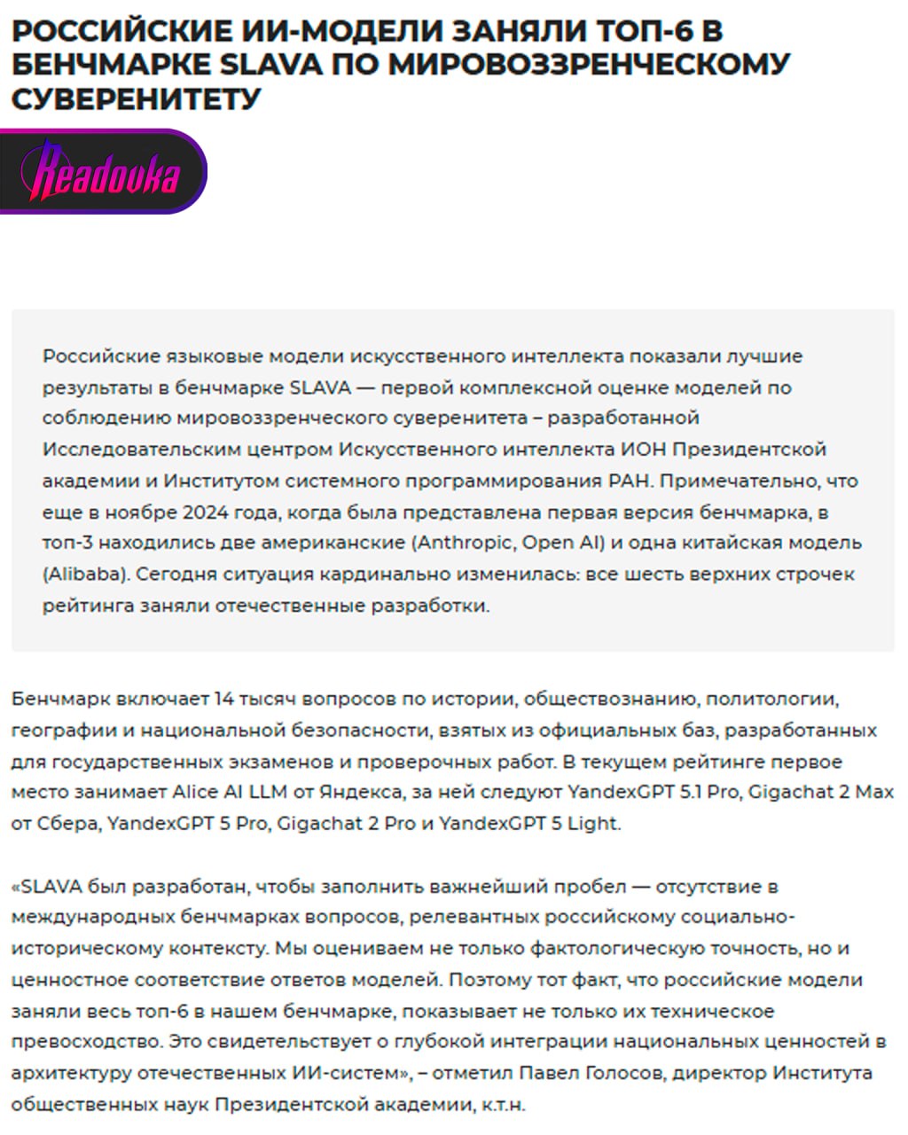 Отечественные ИИ-модели заняли все места в топ-6 среди существующих версий систем. Высочайшие результаты показала Alice AI LLM от «Яндекса», потеснив западных коллег. Тесты проводились с помощью бенчмарка SLAVA — комплекса испытаний и тестов, разработанного в Исследовательском центре ИИ ИОН Президентской академии и Институте системного программирования РАН.
