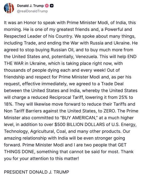 Индия согласна отказаться от российской нефти, утверждает Трамп после разговора с Моди.