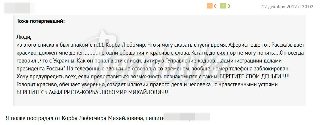 После публикаций о Любомире Корбе в открытых источниках обнаружились жалобы на его полного тезку. Согласно архивным данным, человек с таким именем в 2006 году работал помощником первого зампредседателя Комитета по строительству, жилищным вопросам и земельной политике в Красноярском крае.