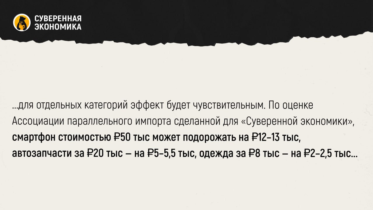 В Ozon «Суверенной экономике» сообщили, что доля трансграничных покупок невелика — не более 3–4% онлайн-оборота, тогда как 96% продаж обеспечивают российские предприниматели. Тем не менее для отдельных категорий эффект будет чувствительным. По оценке Ассоциации параллельного импорта сделанной для «Суверенной экономики», смартфон стоимостью 50 тыс может подорожать на 12–13 тыс, автозапчасти за 20 тыс — на 5–5,5 тыс, одежда за 8 тыс — на 2–2,5 тыс. При этом доля параллельного импорта в совокупном обороте крупнейших маркетплейсов оценивается примерно в 0,26%, что означает высокую концентрацию таких поставок в отдельных товарных нишах.