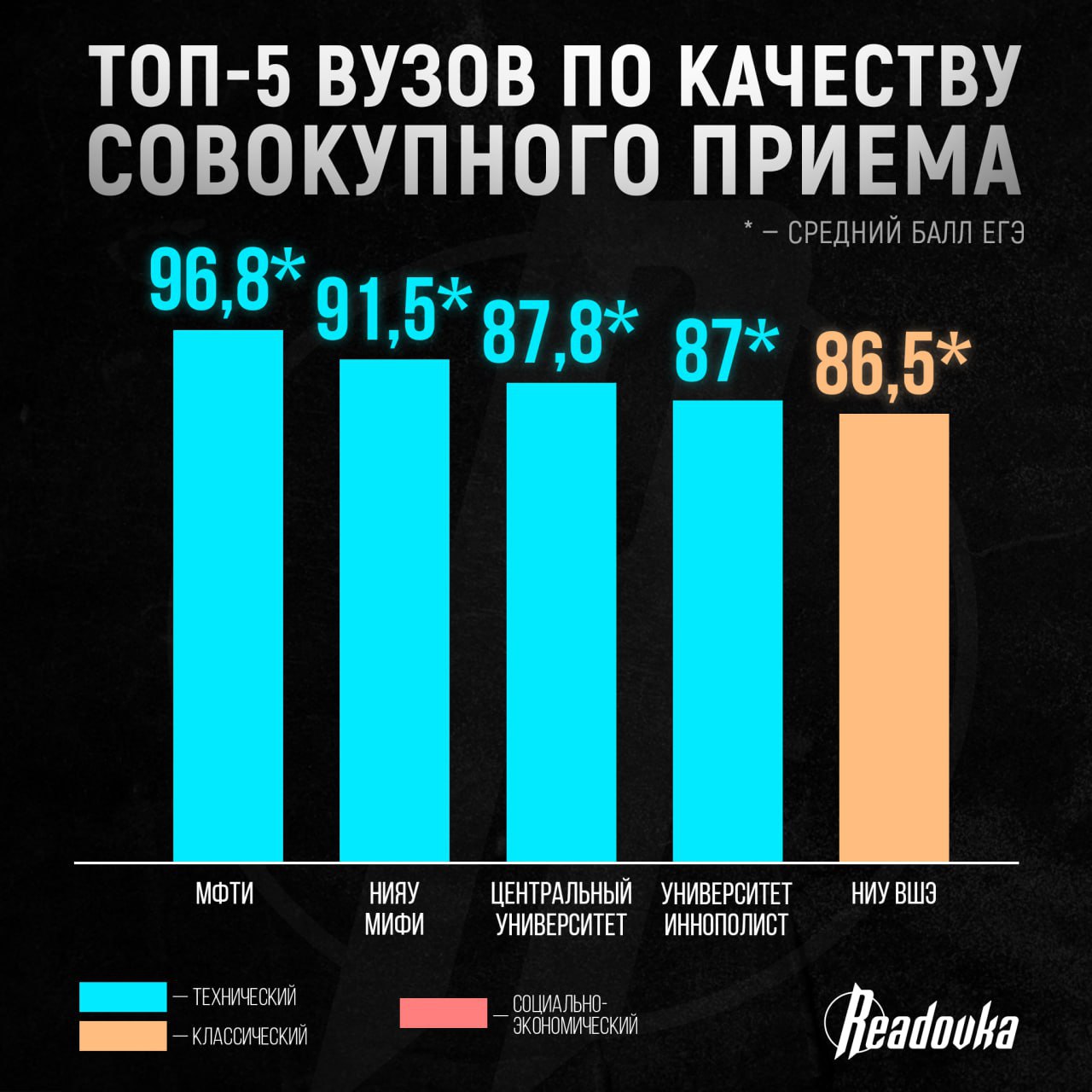 На первом месте в совокупном приеме (студенты на платной и бюджетной основе) в 2025 году — МФТИ, который набрал студентов со средним баллом 96,8 по ЕГЭ (-0,2 балла к 2024). На втором — МИФИ с 91,5 балла (+1,6 балла к 2024), а на третьем — Центральный университет, абитуриенты которого в среднем поступили с 87,8 балла (+3,1 балла к 2024). Эти вузы преимущественно специализируются на математике и ИТ.