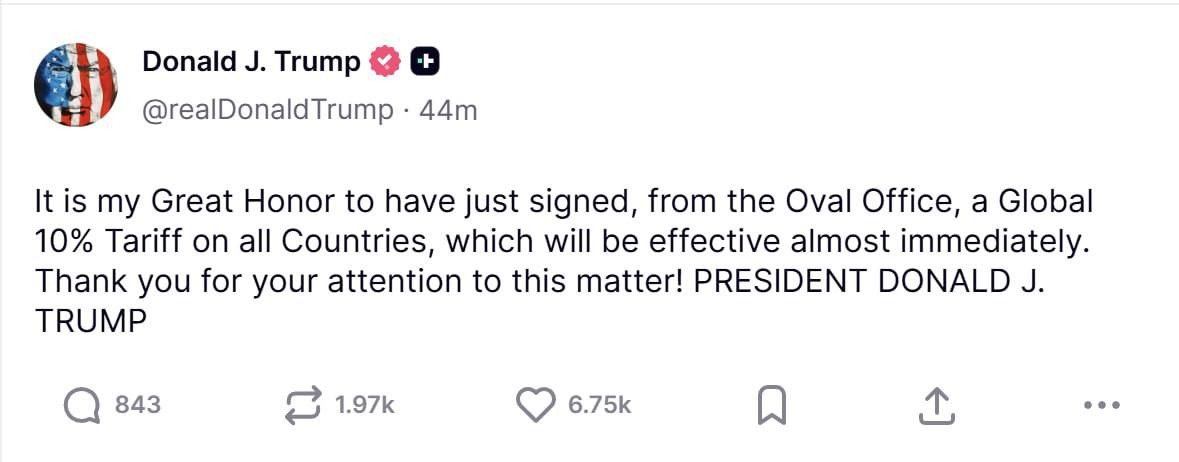 Трамп подписал указ о введении 10% пошлин для всего мира