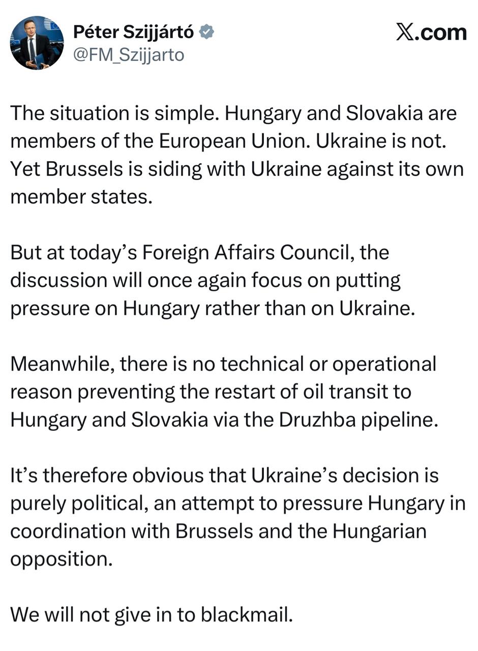 "Ситуация проста. Венгрия и Словакия являются членами Европейского союза. Украина — нет. И тем не менее Брюссель встает на сторону Украины против ее собственных государств-членов. Однако на сегодняшнем заседании Совета по иностранным делам дискуссия вновь будет сосредоточена на оказании давления на Венгрию, а не на Украину.