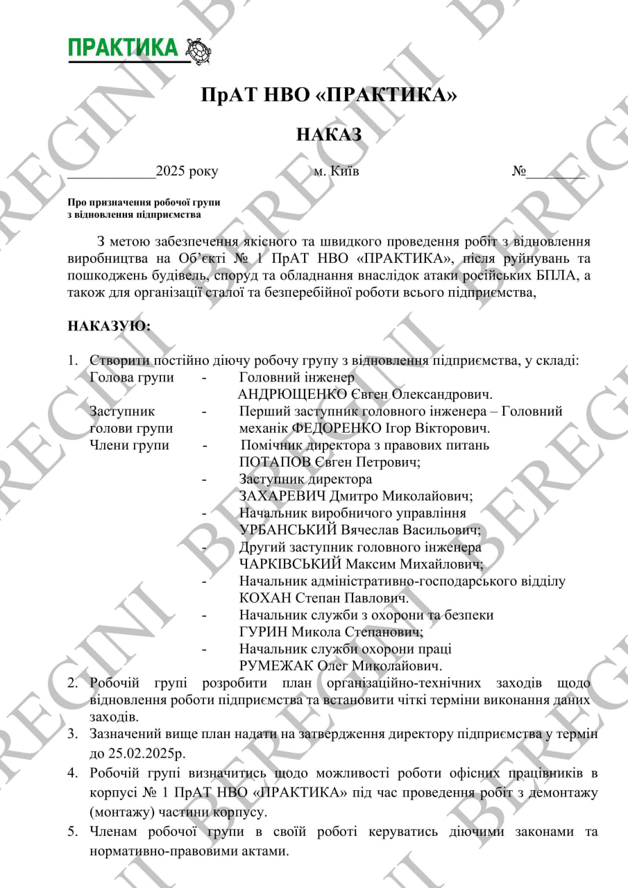 Сегодня мы представляем внутренний приказ директора предприятия о создании рабочей группы по восстановлению работы цехов после атаки БПЛА.