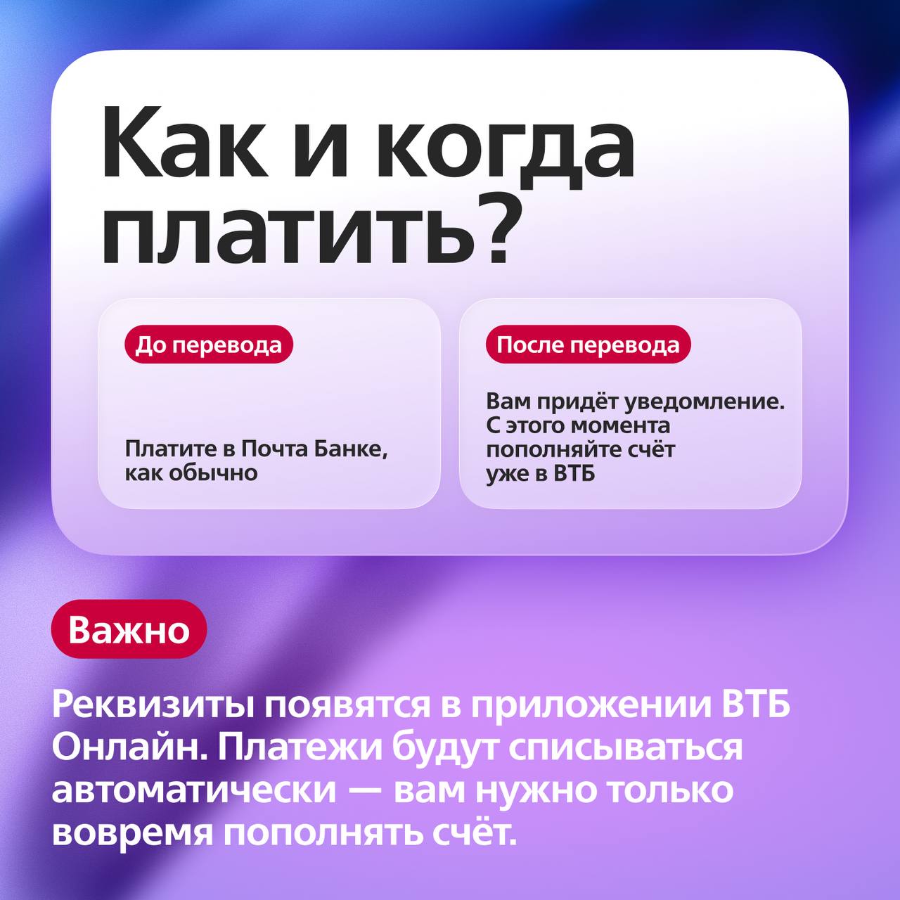 Чтобы продолжить закрывать платежи, нужно открыть счёт в ВТБ. Это делается онлайн всего за несколько минут. Ставка, сумма и график при этом останутся без изменений. Чуть подробнее о процедуре перехода — на карточках.