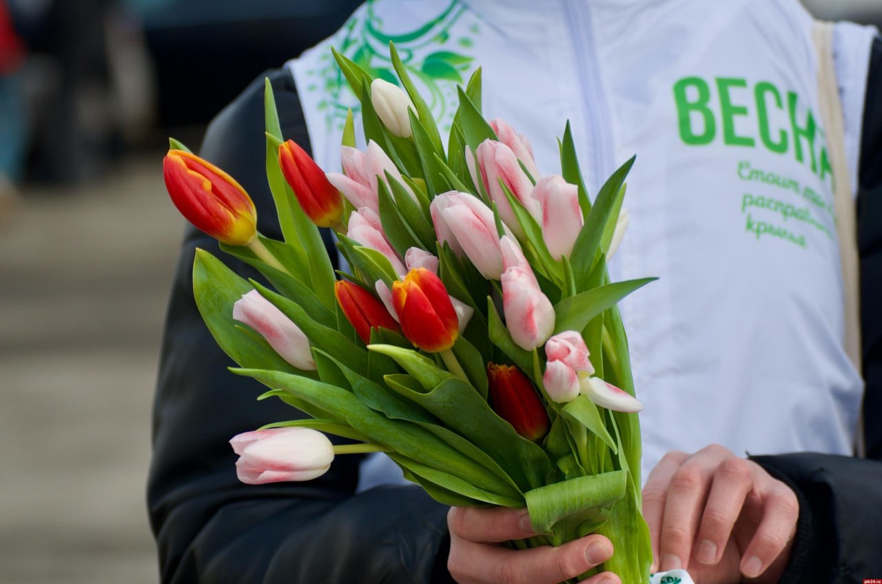 Цветы вручались волонтерами Ресурсного центра добровольчества одновременно на площади Ленина и в районе Четырех углов в Пскове. Каждой девушке и женщине подарили тюльпаны — главный символ праздника.