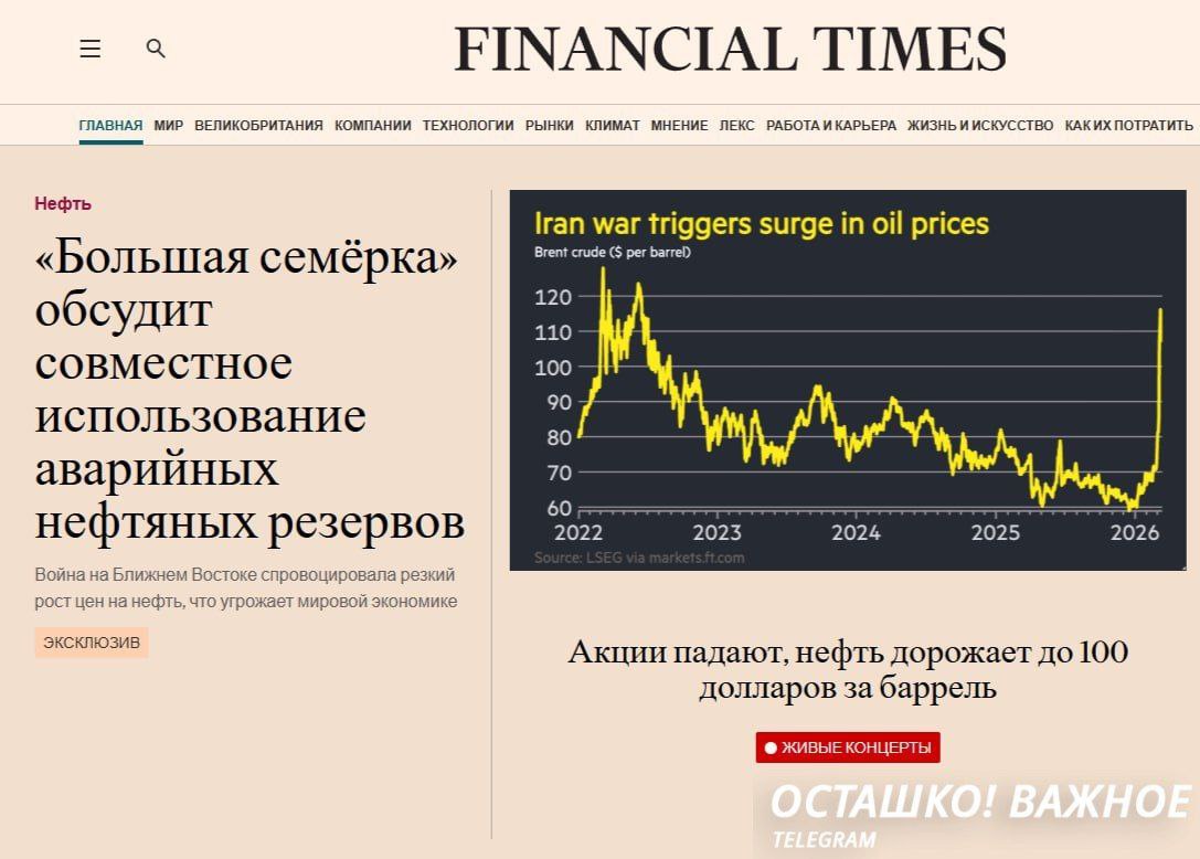 По данным Financial Times, участники обсуждают возможность выброса на рынок 300–400 млн баррелей нефти из стратегических резервов. Три страны G7, включая США, уже согласились на задействование своих запасов.