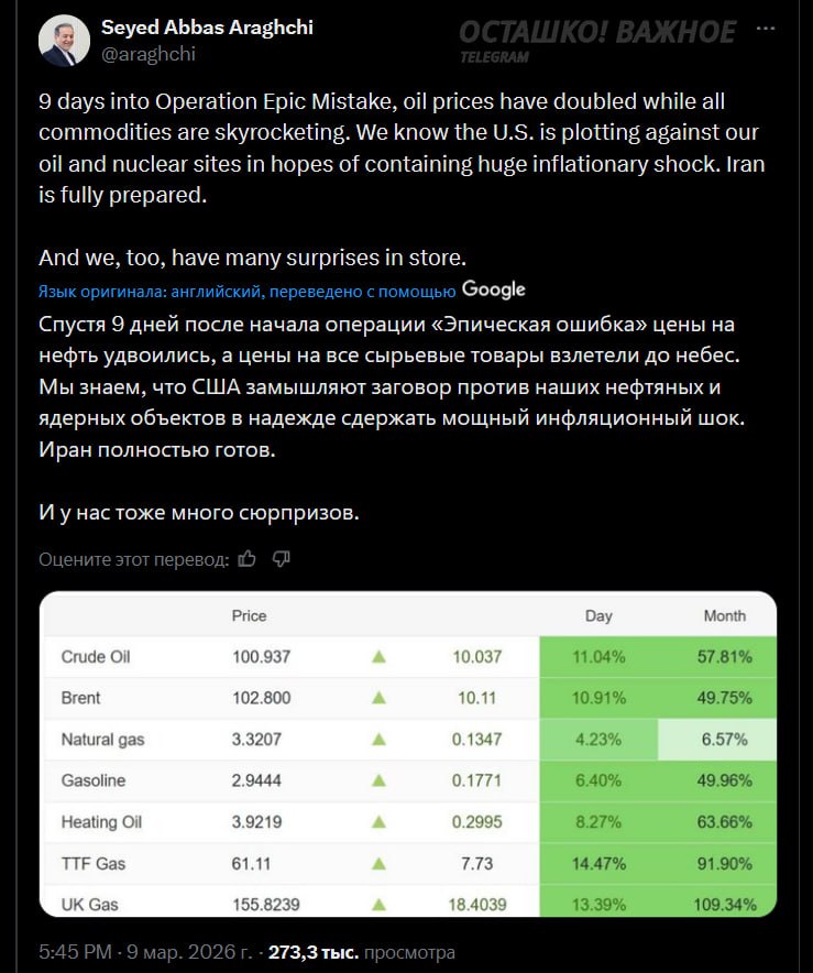 «Спустя 9 дней после начала операции "Эпическая ошибка" цены на нефть удвоились, а цены на все сырьевые товары взлетели до небес. Мы знаем, что США замышляют заговор против наших нефтяных и ядерных объектов в надежде сдержать мощный инфляционный шок. Иран полностью готов».