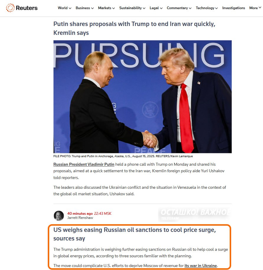 Reuters со ссылкой на источники сообщает, что администрация Трампа рассматривает «возможность смягчения российских санкций на нефть для смягчения роста цен».