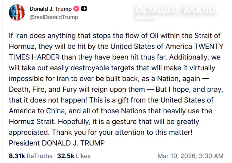 Американский президент написал в Truth Social, что если Иран остановит поток нефти через Ормузский пролив: