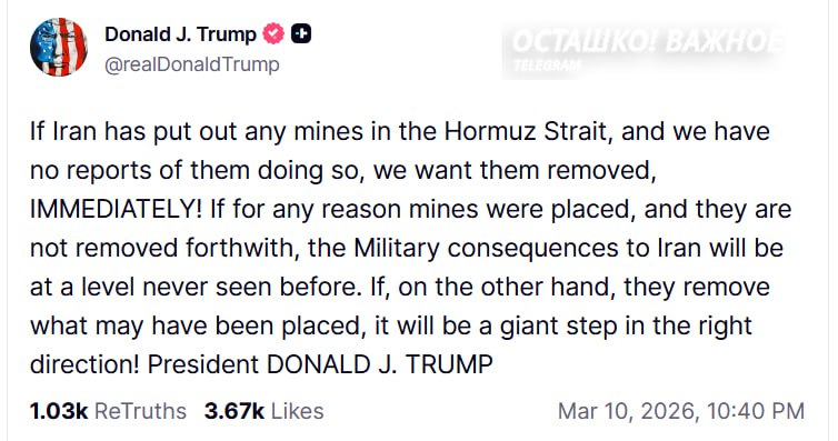 «Если Иран установил какие-либо мины в Ормузском проливе, и у нас нет сообщений об этом, мы требуем их немедленного обезвреживания! Если по какой-либо причине были установлены мины, и они не будут немедленно обезврежены, военные последствия для Ирана будут беспрецедентными»